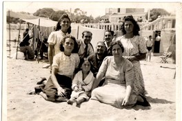 Grupo familiar, compuesto por mujeres, hombres y una niña, aparecen en la fotografía en balneario no identificado, que podría ser Cartagena. Al fondo, las casa cercanas a la playa y la tradicional terrraza de ese balneario.