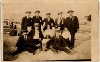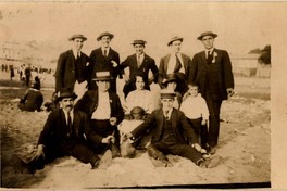 Grupo de personas, compuesto por hombres mayoritariamente y por dos mujeres, aparecen retratados junto a un niño, en un balneario donde además, se observa a otros veraneantes.