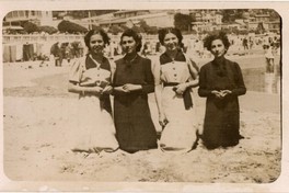 Fotografía de cuatro mujeres arrodilladas en la playa de Cartagena. De fondo se aprecian las tiendas y parte de las construcciones aledañas.