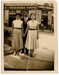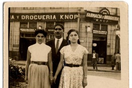 Fotografía de dos mujeres tomadas de la mano en la Plaza Echaurren de Valparaíso, junto a un hombre que aparece en medio de ellas. De fondo, se lee en un letrero publicitario "Farmacia y droguería Knop".