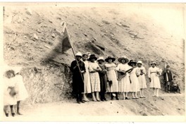 Procesión de mujeres en un cerro, acompañadas por algunos niños. Una de ellas porta un bandera y otras, una guitarra y flores.