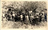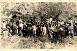 Grupo de niños retratados en un cerro, algunos de ellos con ramos de matas verdes en sus manos. Los dos adultos que aparecen en la fotografía portan la bandera de Chile.