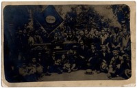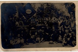 Ceremonia funeraria masiva. En el centro de la fotografía se encuentra el féretro rodeado de personas. Atrás se observa estandarte "Sociedad Asistentes FECC del E. Fundada nov. 1922 Santiago".