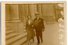 [Pareja caminando frente a un edificio] [fotografía]. [Santiago?] : [entre 1920 y 1930]. 1 fotografía : monocromo, gelatina sobre papel fibra ; 14 x 9 cm. .