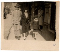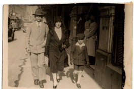 [Familia caminando por una calle céntrica] [fotografía]. [Santiago?] : 1930. 1 fotografía : monocromo, gelatina sobre papel fibra ; 9 x 7 cm. .