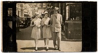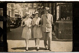 [Mujeres y hombre caminando por calle céntrica] [fotografía]. [Santiago?] : entre 1920 y 1930]. fotografía : monocromo, gelatina sobre papel fibra ; 5 x 9 cm. .