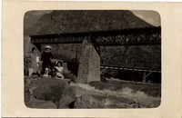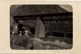 Dos mujeres de pie aparecen retratadas junto a un niño pequeño y dos jovenes que se encuentran sentadas en roquerío de un río, justo debajo de un puento de fierro con un cerro de fondo.