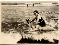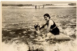 [Madre e hija en playa chica de Cartagena] [fotografía]. [Chile] : [entre 1920 y 1930]. 1 fotografía : monocromo, gelatina sobre papel fibra ; 9 x 12 cm. .
