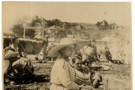 Mujer con sombrero y que mira de perfil, aparece en la fotografía junto a otros veraneantes que disfrutan en un balneario del Litoral Central. De fondo, se aprecian las tiendas del lugar, y más atrás, las construcciones ubicadas en las colinas de esa localidad.