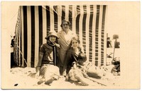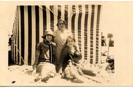 Tres mujeres y una niña, aparecen en la fotografía en un balneario y delante de una tienda (carpa).