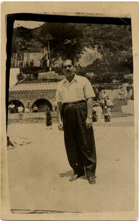 Hombre aparece retratado de pie en un balneario, de espalda a una construcción de piedra y a una escalera que conduce a una colina, en la que se observa a otros veraneantes.