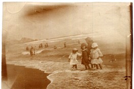 Niñas con vestidos, aparecen en la fotografía bañándose en el mar, donde se observa a otros bañistas de ese balneario.