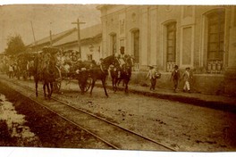 [Carruajes pasan por línea del tren] [fotografía]. [Chile] : [191-?]. 1 fotografía : monocromo, gelatina sobre papel fibra ; 4 x 9 cm .