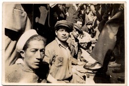 Una fila de hombres lustrabotas con boinas, aparecen en la fotografía mirando en dirección a la cámara, entre multitud de personas.