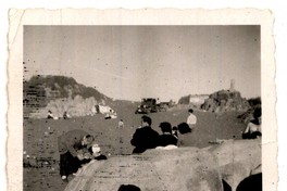 Mujer adulta con pañuelo en la cabeza, aparece en la fotografía delante de roca, desde la cual se observa a otros veraneantes en ese balneario no identificado. De fondo, montículos rocosos y un automóvil.
