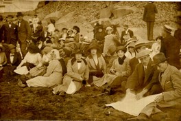 Grupo de personas adultas de ambos sexos, aparecen en la fotografía con sombreros y bastones de apoyo, sentadas y de pie, en balneario de Constitución. Dos de los retratados leen un periódico.