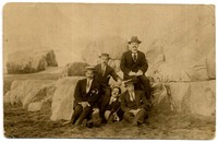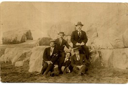 Cinco hombres con sombreros y bastones de apoyo, aparecen en la fotografía reunidos y sentados en la arena o en las rocas de balneario, presumiblemente de Constitución.