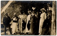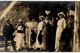 [Grupo de personas en sitio campestre] [fotografía]. Constitución : 1915. 1 fotografía : monocromo, gelatina sobre papel fibra ; 9 x 14 cm .