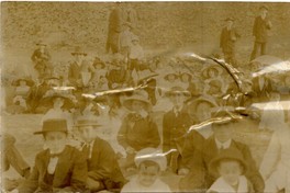 Grupo de personas adultas y niños de ambos sexos, aparecen retratados delante de montítulo de arena y roca, en balneario de Constitución.