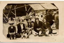 Grupo de mujeres y un niño, aparecen en la fotografía sentados en balneario de San Antonio. Atrás, otros veraneantes, un niño vendedor y una construcción consistente en un techo perpendicular, al parecer recubierto con un material orgánico.
