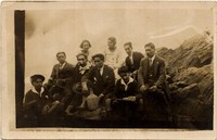 Grupo de personas adultas de ambos sexos, aparecen en la fotografía sentadas en roquerío de un balneario. Dos de los retratados sostienen una botella y una damajuana.