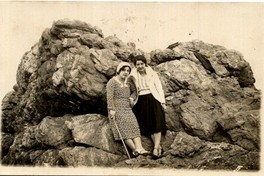 Dos mujeres adultas, aparecen en la fotografía de pie en roquerío de un balneario no identificado.