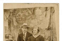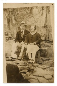 [Mujer y hombre sentados en roquerío] [fotografía]. [Chile] : [entre 1920 y 1930]. 1 fotografía : monocromo, gelatina sobre papel fibra ; 14 x 9 cm .