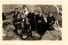 Grupo familiar aparece en la fotografía en roquerío de un balneario no identificado, con bastones de apoyo.