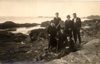 [Personas en roquerío de un balneario] [fotografía]. [Chile] : [entre 1920 y 1930]. 1 fotografía : monocromo, gelatina sobre papel fibra ; 9 x 14 cm .