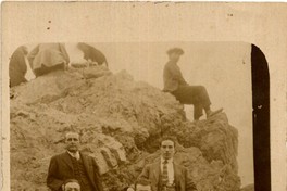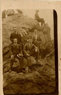 Cuatro hombres con sombrero, aparecen en la fotografía sentados y de pie sobre montículo rocoso de un balneario no identificado, en el que se observa además, a un adolescente con boina y a otras personas que apenas se distinguen en lo alto de la roca. Dos de los hombres sostienen algas en las manos.