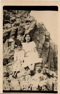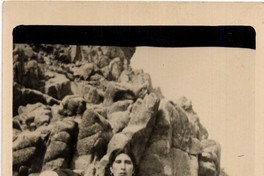 [Mujer y niño en roquerío de un balneario] [fotografía]. [Chile] : 1952. 1 fotografía : monocromo, gelatina sobre papel fibra ; 14 x 9 cm .