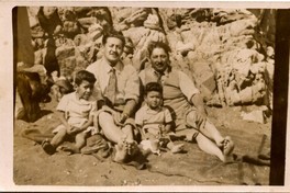 Dos hombres adultos, aparecen en la fotografía descalzos y junto a dos niños pequeños, en un balneario no identificado.