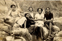 [Mujer y adolescentes en roquerío de balneario de Talca] [fotografía]. Talca : 1941. 1 fotografía : monocromo, gelatina sobre papel fibra ; 9 x 14 cm .