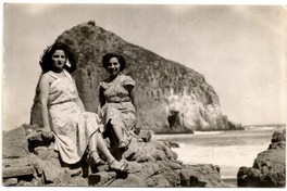 Dos mujeres jovenes con vestidos floreados, aparecen en la fotografía de espalda a montículo rocoso "Piedra de la Iglesia", en balneario de Constitución.