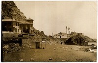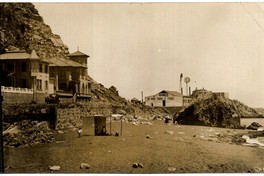 Vista de un balneario en el que aparece en el centro de la fotografía una tienda con niños en su interior, y la que se encuentra bajo a una construcción, la que a su vez, colinda con una colina rocosa. Al fondo, se lee "Baños de mar tibios y fríos".