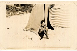 Mujer con boina y pañuelo al cuello, aparece en la fotografía sentada delante de una tienda en un balneario desconocido.