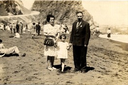 Mujer y hombre adultos, toman la mano de niña pequeña en balneario de Constitución, donde aparecen en la fotografía de espalda a montículo rocoso.