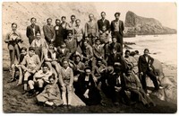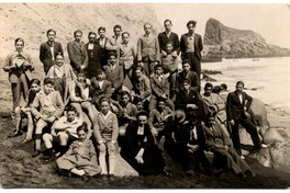 Grupo de niños, jovenes y sacerdotes pertenecientes a un internado, aparecen en la fotografía de espalda a montículo rocoso de un balneario en Constitución.