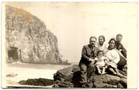 Grupo familiar aparece en la fotografía sentado en roquerío de un balneario en Constitución, y de espalda a la "Piedra de la Iglesia".
