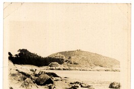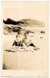 Mujer y hombre jovenes, aparecen en la fotografía sentados sobre la arena, de espalda al mar y a sector rocoso de un balneario, que presumiblemente se trate de Papudo o Zapallar. Al fondo, se observa sector boscoso y una colina en la que aparece una casa.