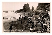 Vista de balneario de Constitución, en el que se observa a los bañistas, veraneantes y las tiendas del lugar. De fondo, la Piedra de las Termópilas.