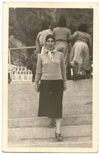 [Mujer con pañuelo en la cabeza bajando una escalera] [fotografía]. [Chile] : 1951. 1 fotografía : monocromo, gelatina sobre papel fibra ; 14 x 9 cm .