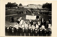 Grupo de uniformados aparecen en la fotografía junto a civiles que observan la ceremonia de los Ex-alumnos de la Escuela Parroquial Club Dep. Union Católica, como se lee en un estandarte. Al fondo, se observan dos construcciones, en una de las cuales se lee "[...] Almacén Central".