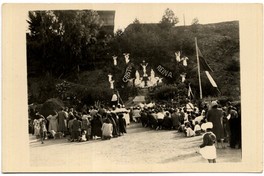 Grupo de fieles cristianos aparecen retratados de pie e hincados en la falda de un cerro en el que se desarrolla una ceremonia religiosa. Al centro de la fotografía, y en medio del cerro, se lee "Cristo Reina", junto a la imagen de Cristo y de la Vírgen María, más abajo aparece una plegaria escrita en una piedra. Se observa alrededor de las imagenes, niñas con atuendos de ángeles que decoran el cerro.