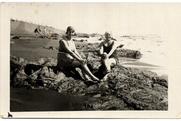 [Mujeres en roquerío de un balneario] [fotografía]. Pichilemu : [entre 1920 y 1930]. 1 fotografía : monocromo, gelatina sobre papel fibra ; 9 x 14 cm .