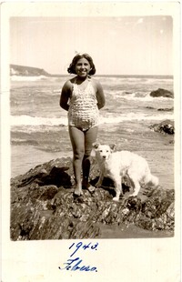 [Niña en roquerío de balneario de Pichilemu junto a un perro] [fotografía]. Pichilemu : 1943. 1 fotografía : monocromo, gelatina sobre papel fibra ; 14 x 9 cm .