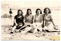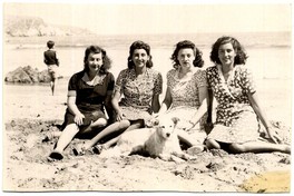 [Mujeres en balneario de Pichilemu junto a un perro] [fotografía]. Pichilemu : [entre 1940 y 1950]. 1 fotografía : monocromo, gelatina sobre papel fibra ; 8 x 12 cm .