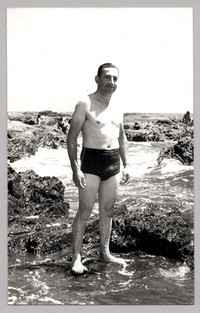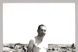 [Hombre en roquerío de balneario de Pichilemu] [fotografía]. Pichilemu : 1968. 1 fotografía : monocromo, gelatina sobre papel fibra ; 14 x 9 cm. .