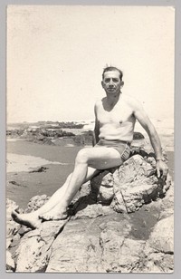 [Hombre en roquerío de balneario de Pichilemu] [fotografía]. Pichilemu : 1968. 1 fotografía : monocromo, gelatina sobre papel fibra ; 14 x 9 cm. .