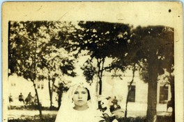 En el centro de la fotografía, se observa a una niña con traje y velo blancos, y que sostiene en su mano un libro y un ramo de azucenas, y que aparece de pie en un parque o plaza no identificada.